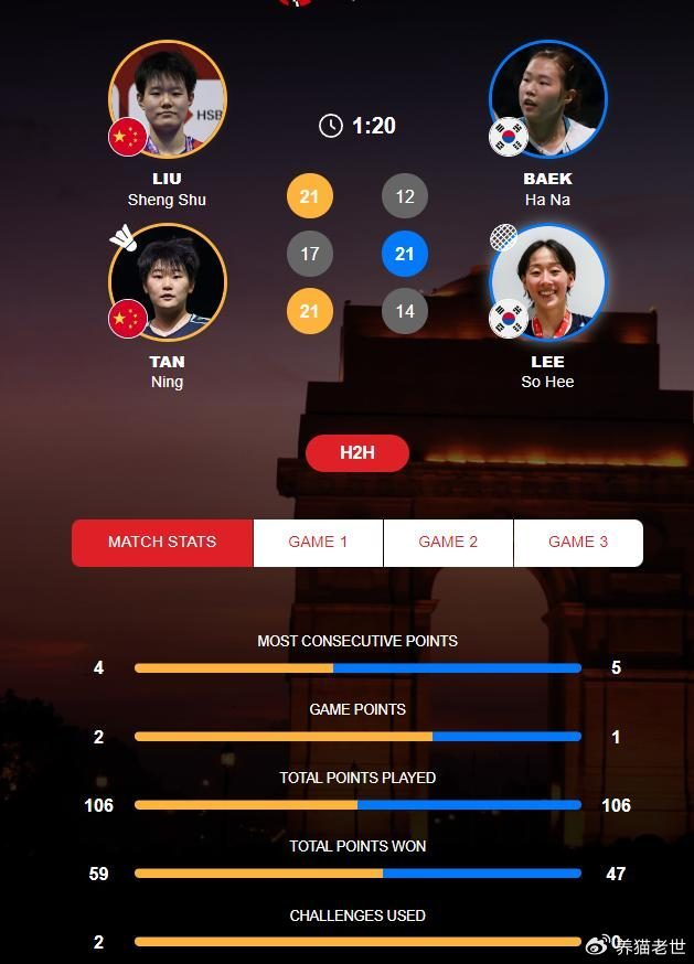 非常清楚韩国王牌女双实力的刘圣书/谭宁,重返赛场之后,依旧不敢有丝毫懈怠,继续用默契的后杀前封打法,去冲击白荷娜/李昭希的防线,如愿在局末阶段,将领先的优势扩大到了19-10,在白荷娜/李昭希连追2分之后,刘圣书/谭宁还以颜色,以21-12先拔头筹。