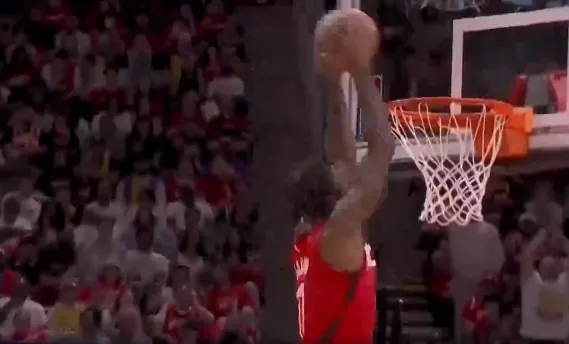 第三节比赛中,谢泼德倒地抢断拉拉维亚,伊森反击暴扣领先22分打停湖人。